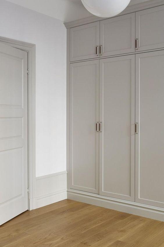 这种样式,一般用行现代、精约风格。门板有造型,外置拉手,不配抽屉。主张是做内部抽屉,隔板收纳尽量多设几层。
