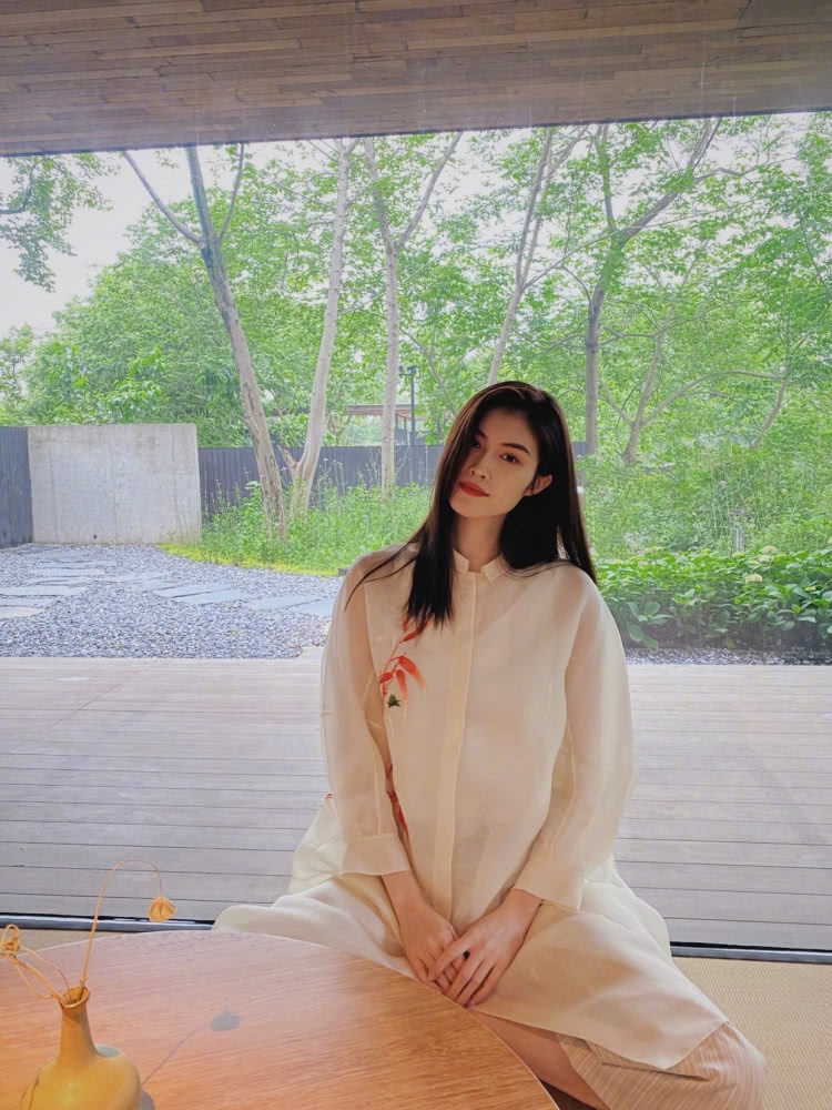何穗能够穿出古典风味,场景也是十分的加分的。原木色的圆桌,很有禅意的花瓶以及蒲团坐垫,轻松营建了十分“佛系”的气氛。跪坐在蒲团上的她,典雅安静的气质扑面而来。