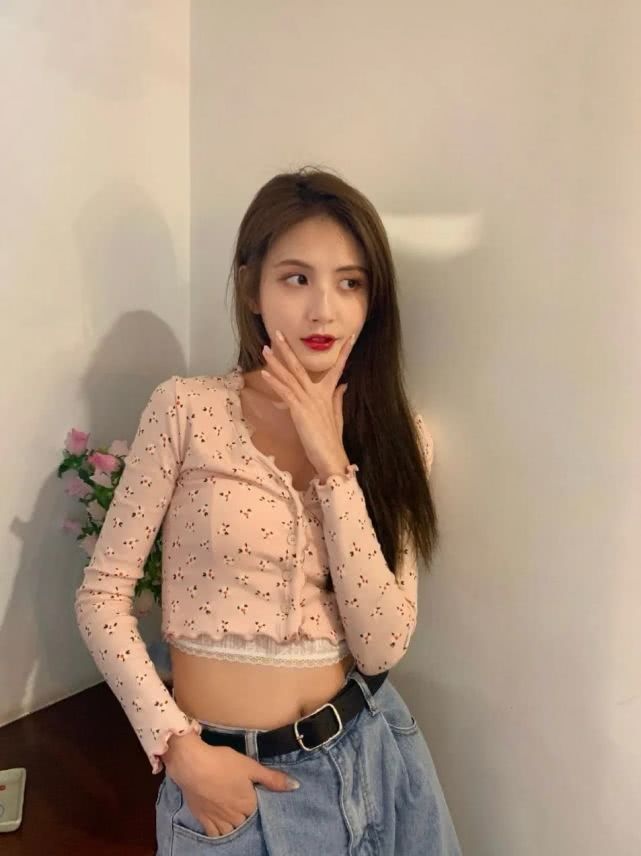 这一套调配几乎太少女了,上衣她穿的是一件碎花短款衣服。首要这件衣服是比较紧身的规划,能够很好的凸显身段线条,咱们咱们能够看到领口以及袖口部分是木耳边的规划,很好的增加了少女感。淡粉色的配色加上心爱的碎花,很有村庄style。甜仇在内搭挑选了一件蕾丝吊带,显露一点点蕾丝边边,给整个穿搭增加了细节,短款的衣服能够很好的显露腰部线条,小蛮腰立现。