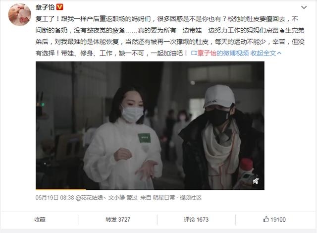5月18日,生完二胎的章子怡发布一条微博:“复工了!跟我相同产后重返职场的妈妈们,许多困惑是不是你也有?松懈的肚皮要瘦回去,不间断的备奶,没有整夜觉的疲乏……真的要为一切一边带娃一边努力工作的妈妈们点赞 !”并配有一则视频,正式宣告复工。视频中,刚生完二胎不久的章子怡身段纤细,状况适当的好,而她对待工作的仔细情绪以及自律精力,也让人不由为她点赞。