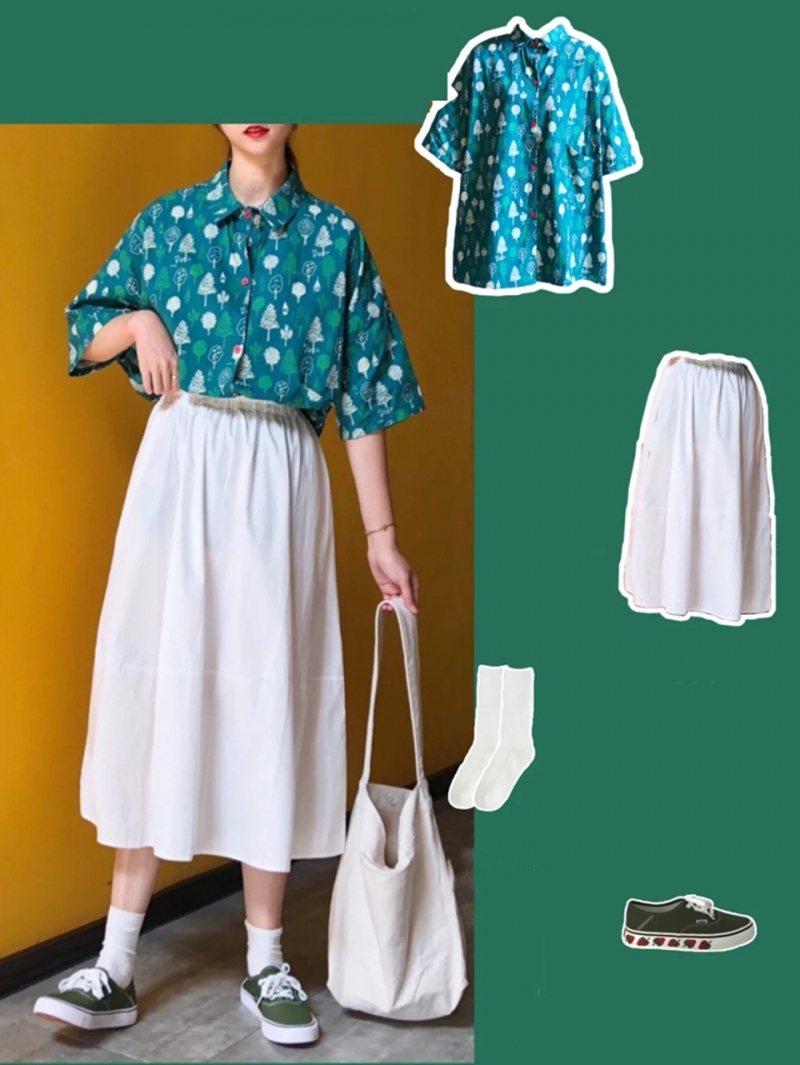 当咱们说起蓝色首先会联想到的是海洋与天空,这套蓝色涂鸦衬衫调配一件半身白纱裙,在蓝色的根柢上添加白色与绿色的树林涂鸦,让人浮想到海洋。