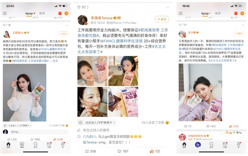 FANCL一方面借势偶像明星、KOL的强大粉丝号召力,另一方面又借助微博平台话题传播优势,成功引起各个年龄层的用户热议,进一步打开了产品的受众市场,产生1+1>2的传播效果,实现品牌与产品的深度曝光。