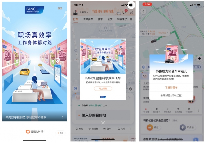 此次FANCL作为打入中国保养品市场首次营销亮相,选择与白领们常用的打车软件滴滴合作,进行跨界尝试,通过【职场真效率 让工作身体都对路】话题切入,深度链接职场人群,传递品牌核心竞争的“体内效率”卖点,不仅吸引了大批目标群体的关注和追捧,更在品牌曝光和流量营销上收获满满,打响了FANCL保健品品类知名度第一枪。