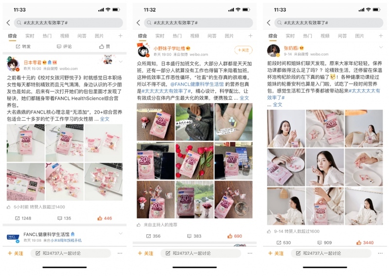 粉丝经济时代,明星大V不仅是消费者崇拜的心中偶像,为其推荐的产品买单更成为自身“忠诚度”的最大体现。FANCL选择@王霏霏Fei@李庚希Teresa@张予曦等不同年龄层的多位明星代表同步微博发声,整合站内外资源进行双向联动,玩转新式营销,为活动提高了声量,吸引大量粉丝参与话题互动。 #太太太太太有效率了#话题一度登上微博热搜榜,引发网友热议。