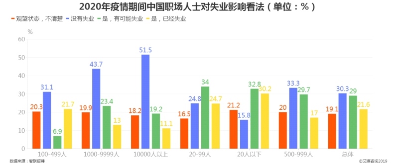 艾媒数据中心发布的数据显示,19.1%的职场人士不清楚职场状况;30.3%的职场人士没有失业;29%的职场人士有可能失业;21.6%的职场人士已经失业。