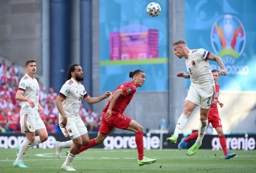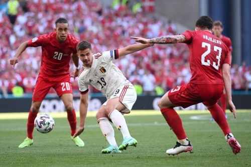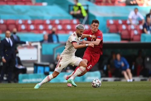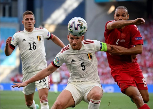 丹麦队在主场球队的助威下,奋起反击。最终在第86分钟,布莱斯维特头球击中横梁后弹出,最终1比2负于比利时。