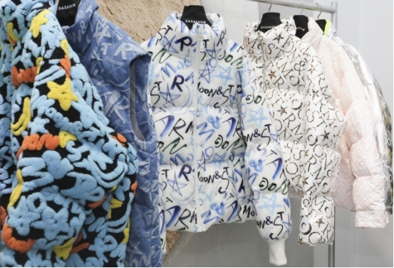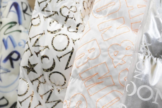 可降解TPU哑光材质白色羽绒服撞色搭配‘大犬座’蓝色涂鸦,透明质感之间呈现轻薄的绒朵,巧妙地实现个性化的时尚态度与可持续发展理念;黑色亮面材质上烫印霓虹色涂鸦字母,跳脱自我带来天马星空的快乐情绪;哑光黑色面料局部点缀‘小犬座’银色亮线刺绣粗体字母,低调奢华;‘天马座’纵横交错的烫印字母展现于时尚银灰色背心羽绒,不同的光线折射出莹莹光辉,流光溢彩;‘仙后座’的白金组合以白色为背景,海报式斜体排列金色字母,为冬日穿着增添时尚气息。