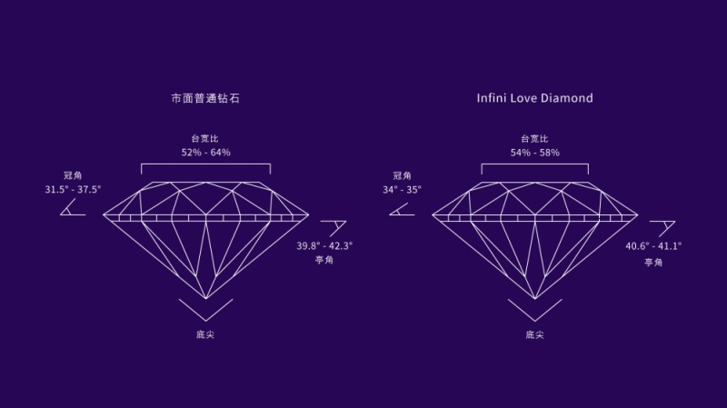 Infini Love Diamond「全爱钻™」拥有57个切割面,面之间的比例、角度,均有十分严格的规范,比全球权威钻石鉴定机构所订立的标准更为严谨。