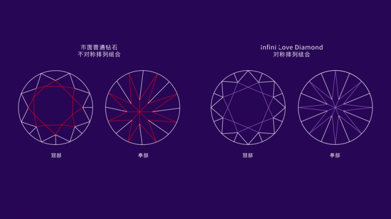 Infini Love Diamond「全爱钻™」以专利技术*,成就每个切割面的工整对称,升华每一道光芒。