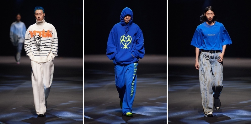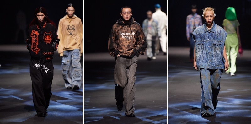 而在千禧年到来时,大量的科技、未来、后机械、仿生人的视觉元素造就了特有的新世纪狂欢。在metersbonwe 2022春夏系列中,一个全新的风格出现了,这就是新金属浪潮下的休闲服饰反叛主义。以“暴力反抗机器”为代表的新金属乐队,在全球范围内曾经掀起过摇滚乐最辉煌的运动,在思想表达和音乐表现上,他们给其他审美领域带来了强烈的刺激,这种跨文化背景的组合形式构成了新一代青年的穿着选择。