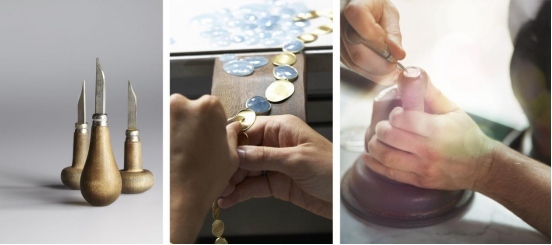 除却科技进步,雕刻依旧深是一项受人为因素影响的技艺。其中,精确性、控制力与热情专注等专业态度是雕刻大师打造上乘珠宝作品的重要品质。每个金匠都有专用工具,多年的工艺经验已促使刻刀和他们身体浑然一体。他们娴熟地运用单刀头和多刀头刻刀,沿相同方向雕刻多重纹路,令18K黄金表面反射出深邃细腻的金色光泽。